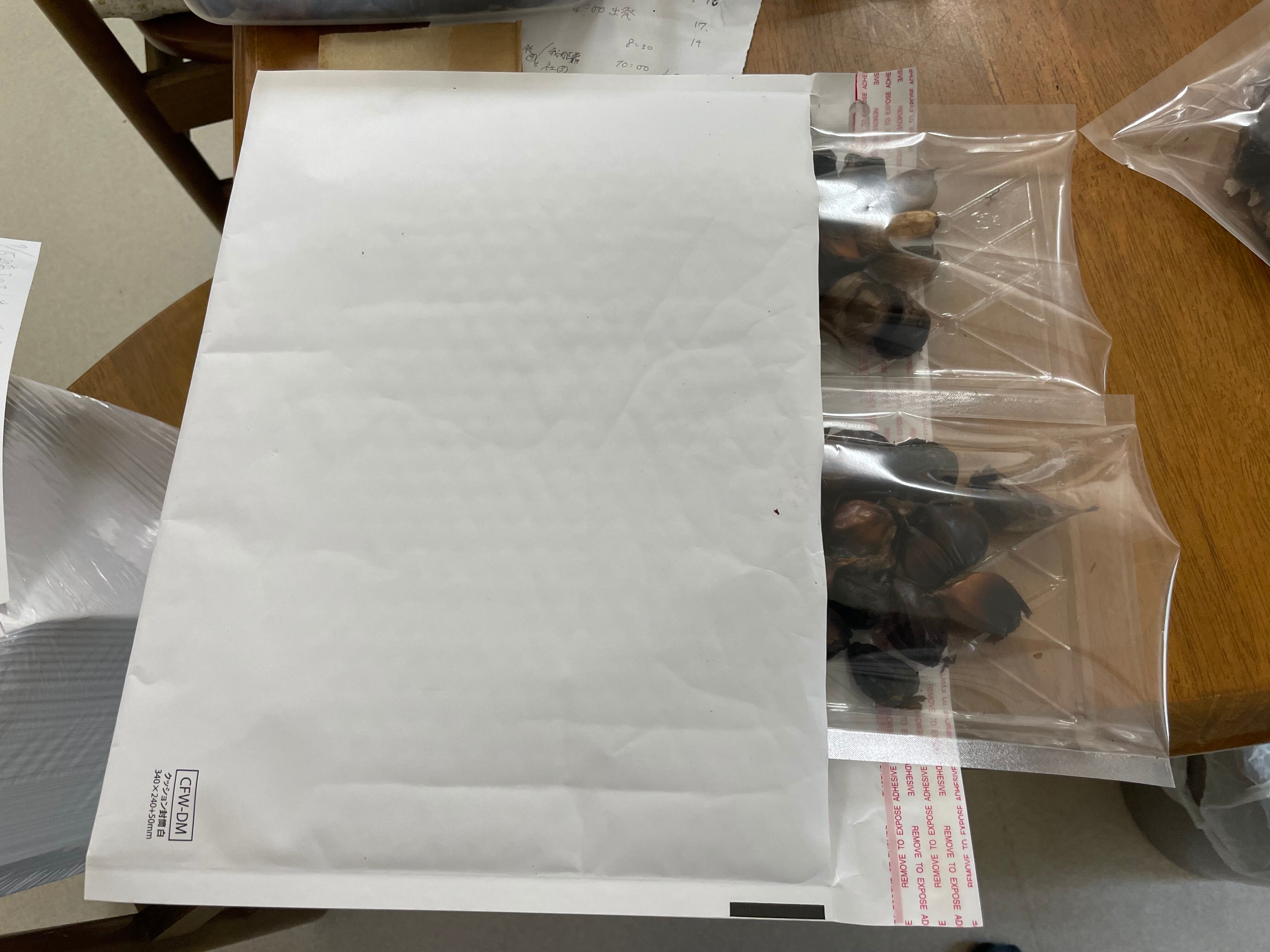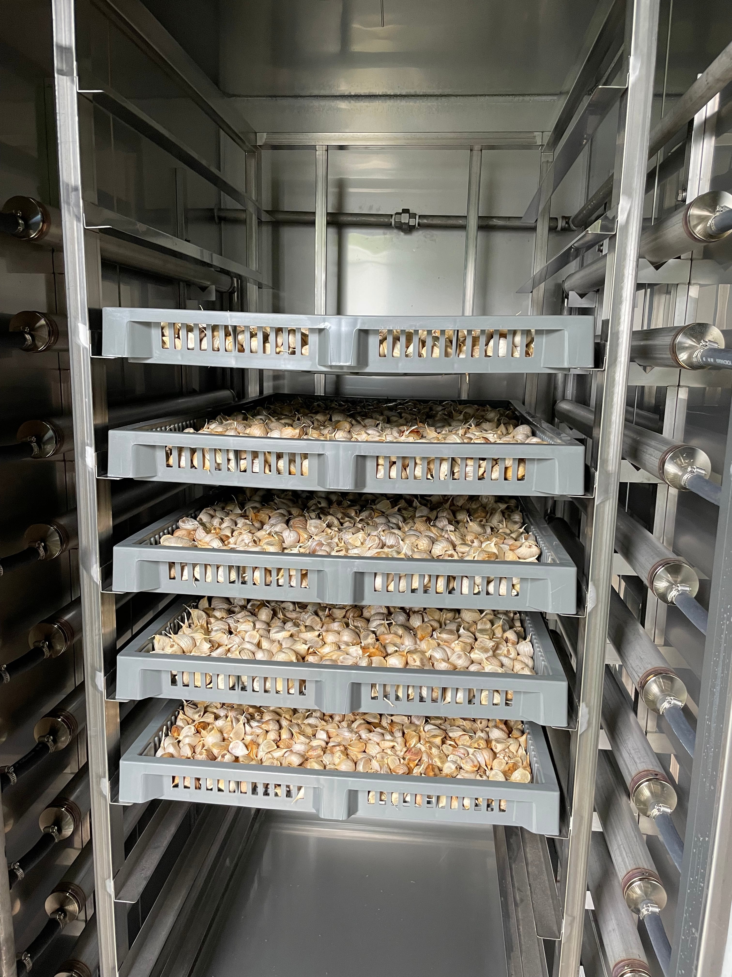 自家生産(山口県産)のにんにくを自家加工して作った『黒にんにく』です。黒にんにくは普通の白いにんにくを、一定の温度(50~70℃)と湿度を保った状態で2週間から1ヵ月熟成させます。するとメイラード反応により白いにんにくが黒く変色していきます。にんにく特有の刺激臭は無くなり、ドライフルーツのような甘みと食感になります。アルギニンやポリフェノールが増加するなど高い健康・美容効果が期待できるヘルシーな食品なのです。